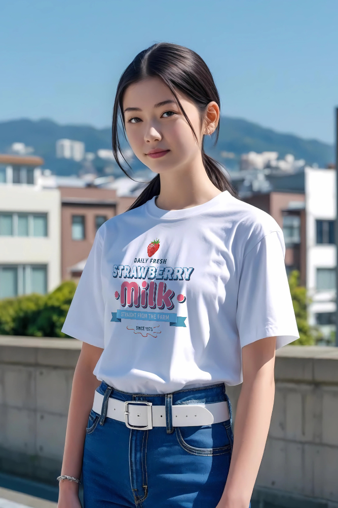 懐かしさと新しさが溶け合う「DAILY FRESH STRAWBERRY MILK」Tシャツで、あなたの毎日にもっと甘く、心地よい彩りを!