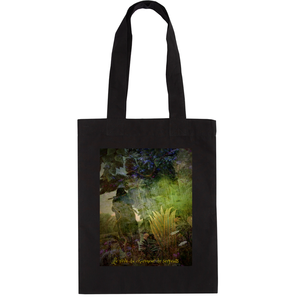 幻想的なコラージュが静かに浮かび上がる、黒地のアートトート。