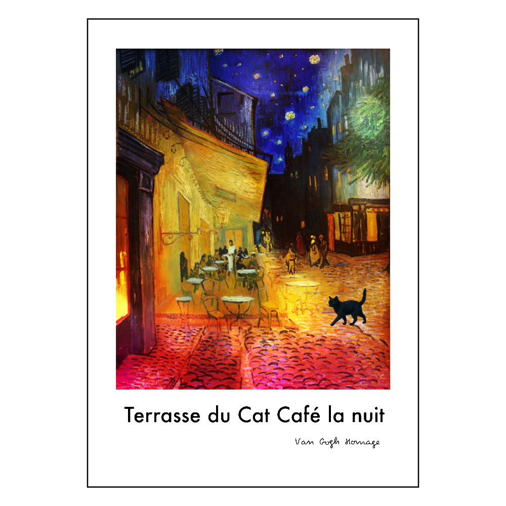 ゴッホの《夜のカフェテラス》にインスパイアされた、猫のいる幻想的な夜景。