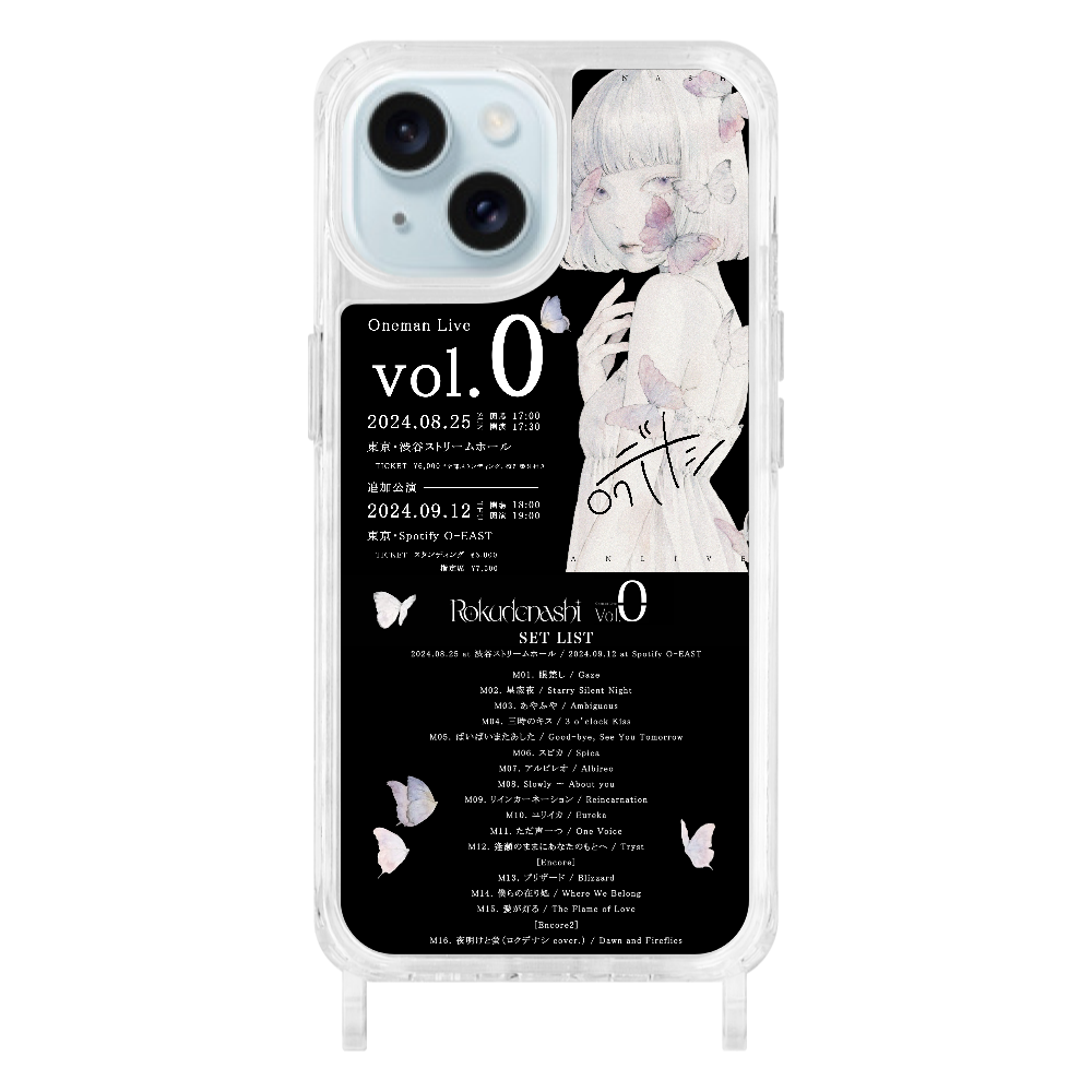 IPhone15専用のスマホケースです. ロクデナシ Oneman Live vol.0のポスター及びセトリを印字しています.