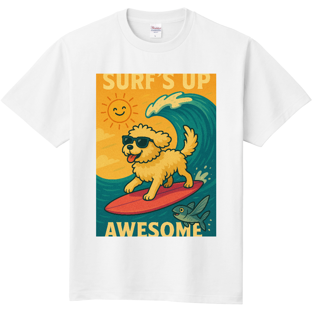 サングラスをかけたワンコがサーフボードで大波に挑む、遊び心たっぷりのデザインTシャツ。