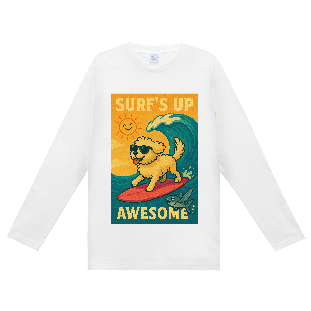 サングラスをかけたワンコがサーフボードで大波に挑む、遊び心たっぷりのデザインTシャツ。