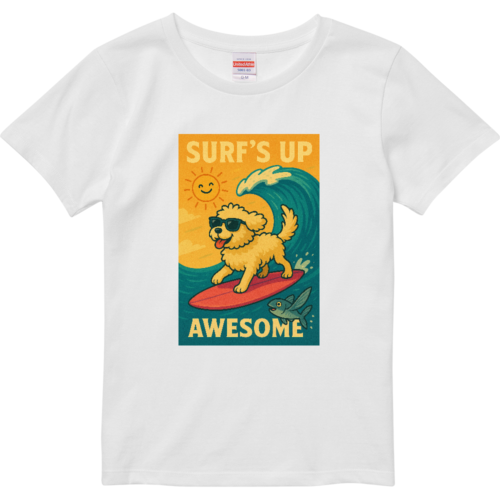 サングラスをかけたワンコがサーフボードで大波に挑む、遊び心たっぷりのデザインTシャツ。