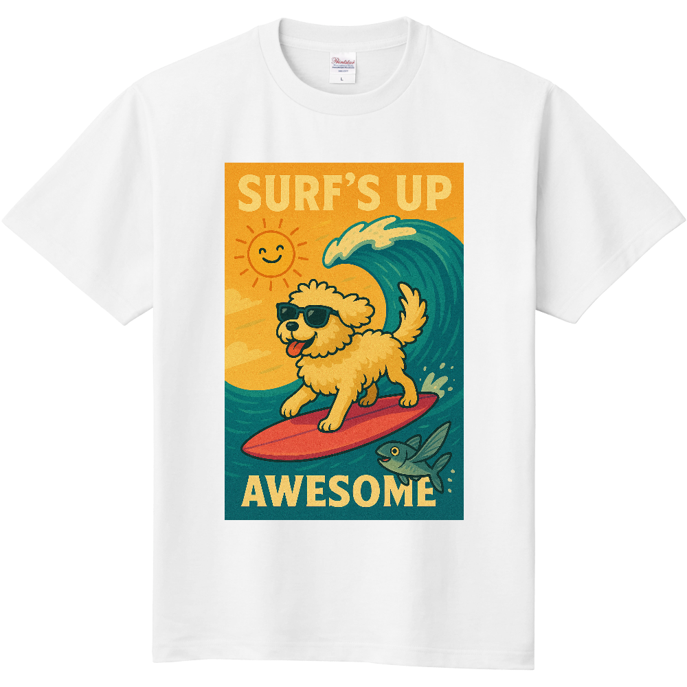 サングラスをかけたワンコがサーフボードで大波に挑む、遊び心たっぷりのデザインTシャツ。
