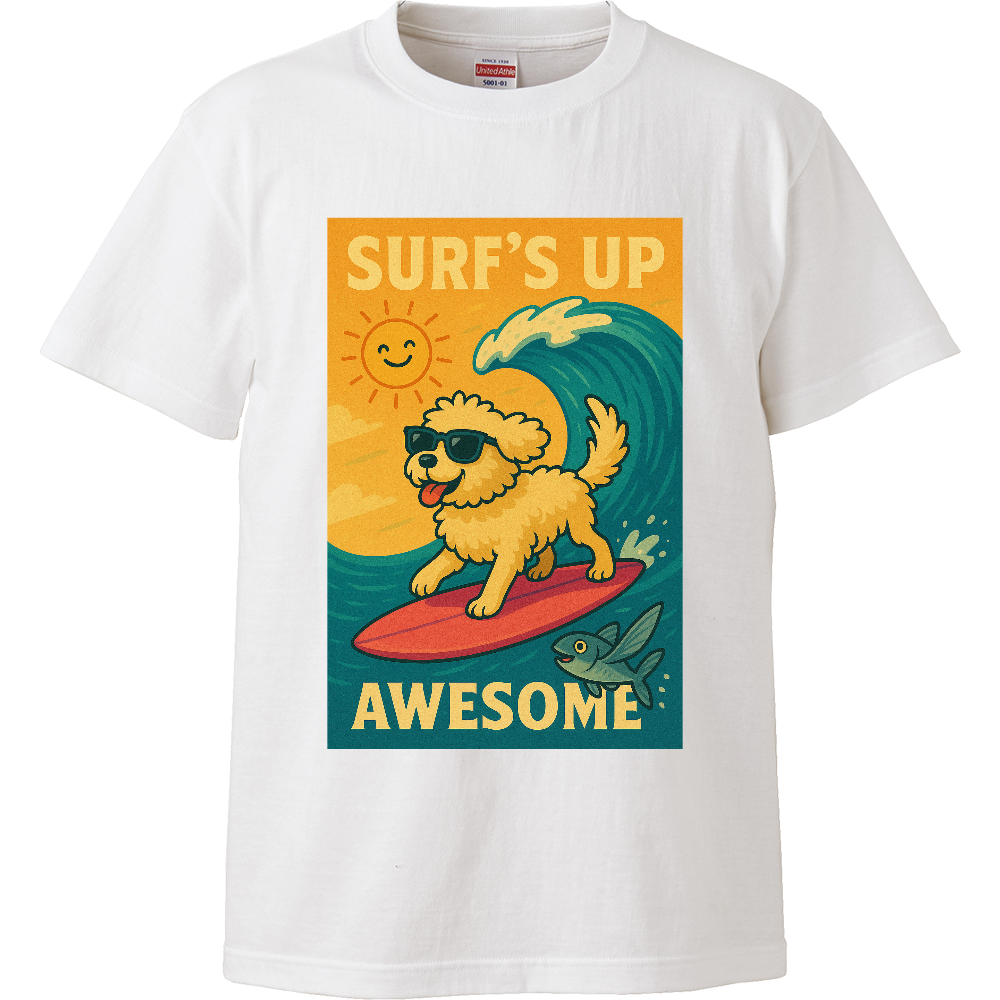 サングラスをかけたワンコがサーフボードで大波に挑む、遊び心たっぷりのデザインTシャツ。