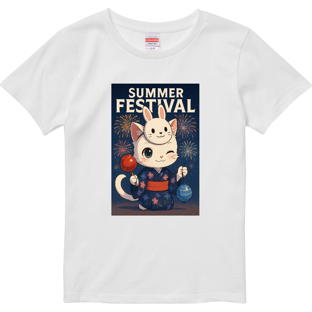 頭にはウサギのお面、手にはりんご飴と水風船を持ち、夏祭りの楽しさをそのまま閉じ込めました。