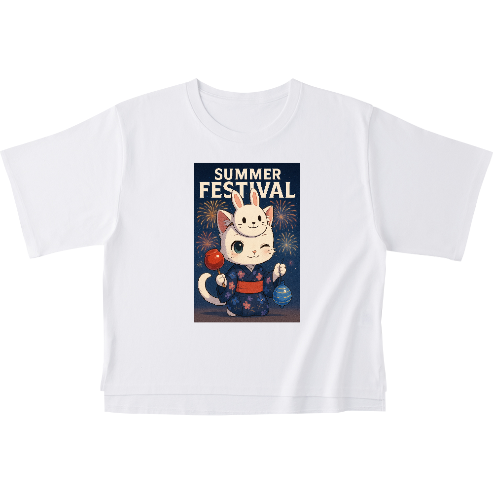 頭にはウサギのお面、手にはりんご飴と水風船を持ち、夏祭りの楽しさをそのまま閉じ込めました。