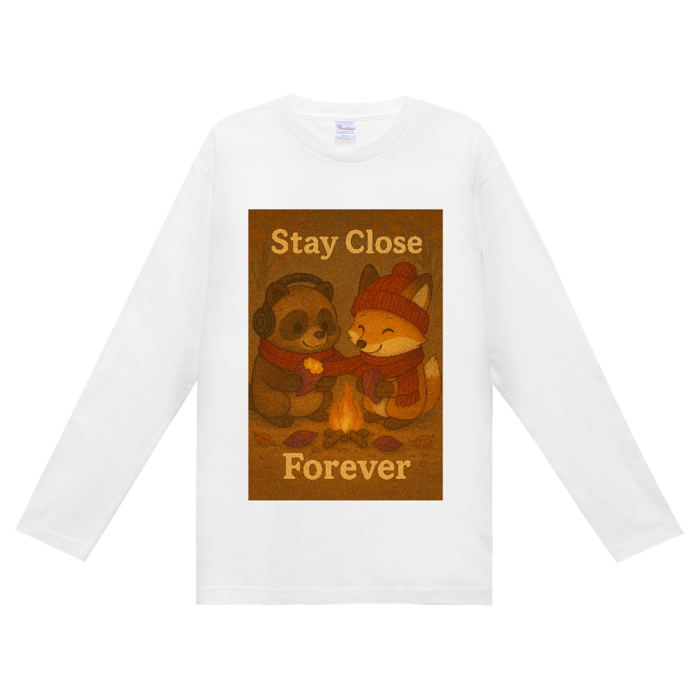 1本のマフラーで繋がり、焚き火を囲んで焼き芋を楽しむ姿に、心が温まるデザインTシャツです。