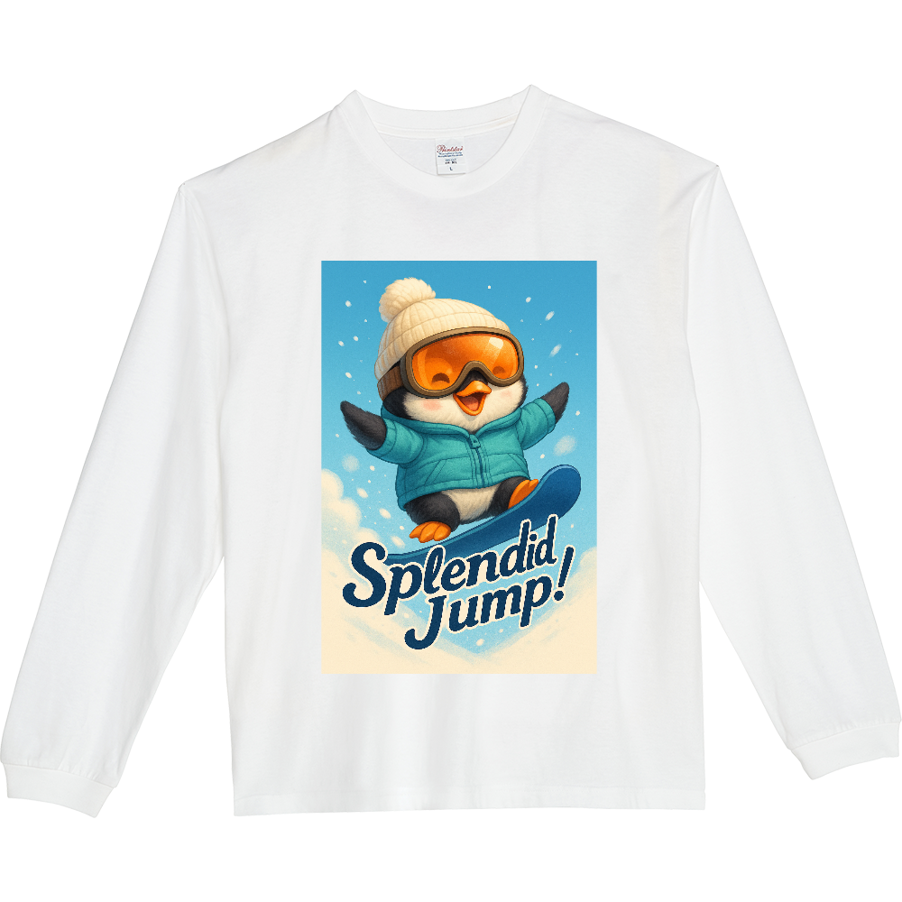 雪山を駆け抜ける元気いっぱいのペンギンが描かれた「Splendid Jump!」Tシャツ。