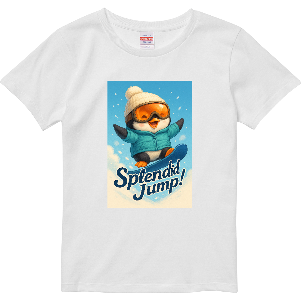 雪山を駆け抜ける元気いっぱいのペンギンが描かれた「Splendid Jump!」Tシャツ。