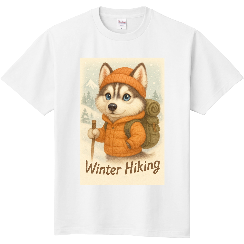 ふんわりとしたタッチで描かれた、可愛いハスキーが冬山を登る「ゆるふわ系」デザインTシャツ。