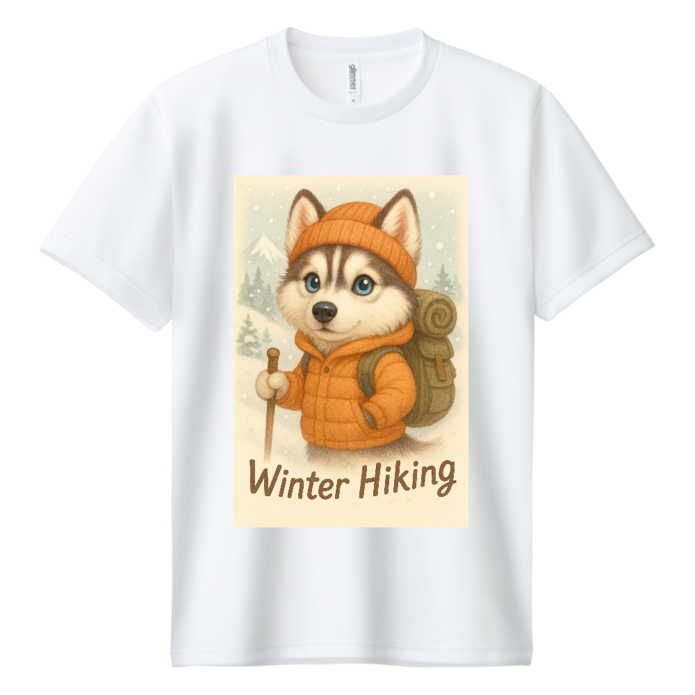ふんわりとしたタッチで描かれた、可愛いハスキーが冬山を登る「ゆるふわ系」デザインTシャツ。