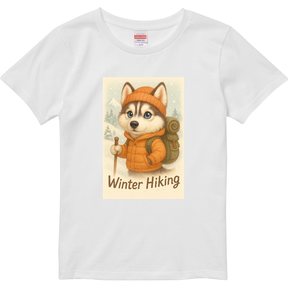 ふんわりとしたタッチで描かれた、可愛いハスキーが冬山を登る「ゆるふわ系」デザインTシャツ。