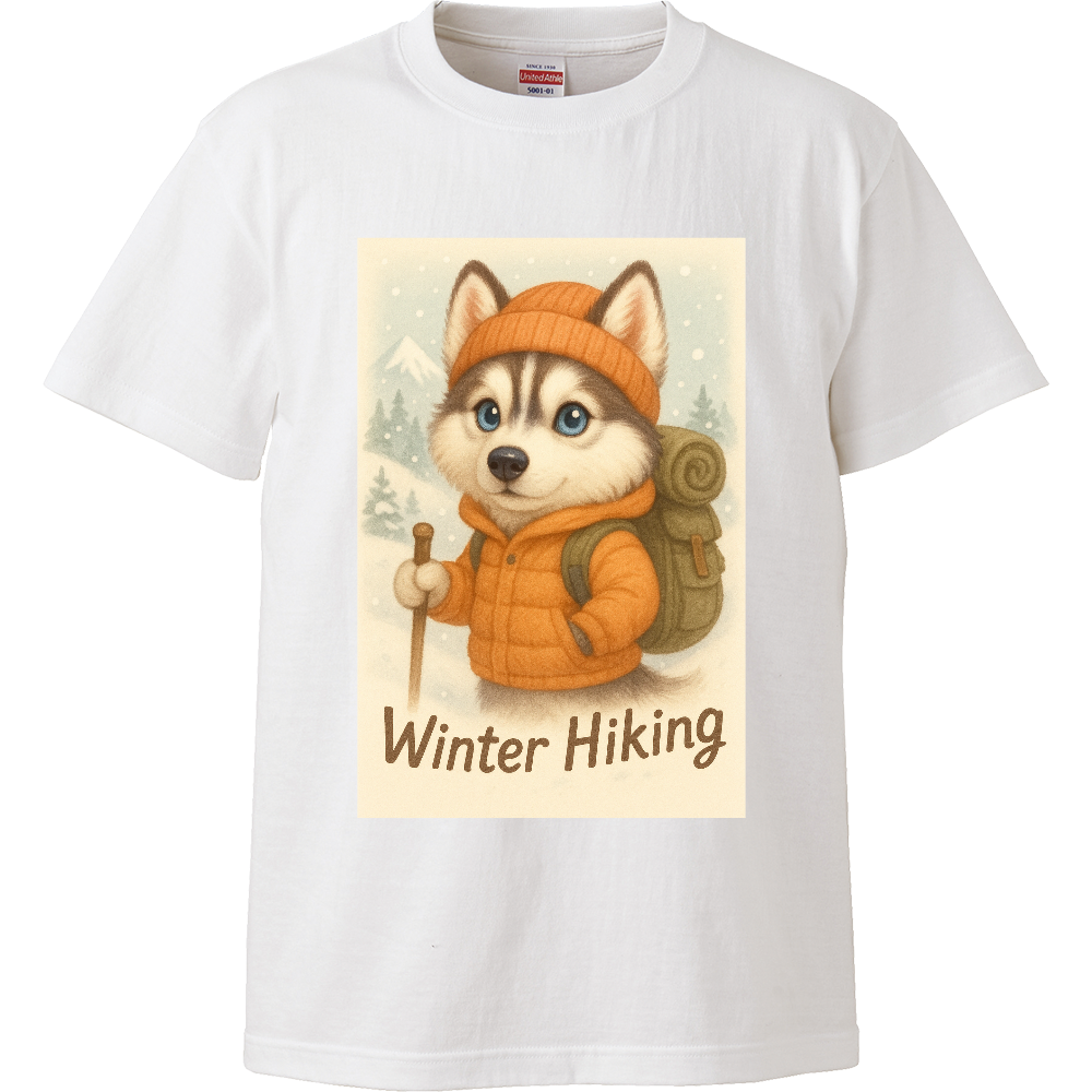 ふんわりとしたタッチで描かれた、可愛いハスキーが冬山を登る「ゆるふわ系」デザインTシャツ。