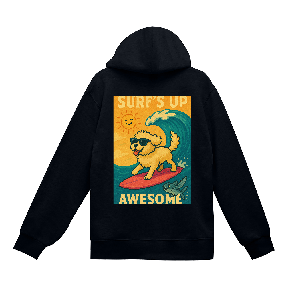 サングラスをかけたワンコがサーフボードで大波に挑む、遊び心たっぷりのデザインパーカー。