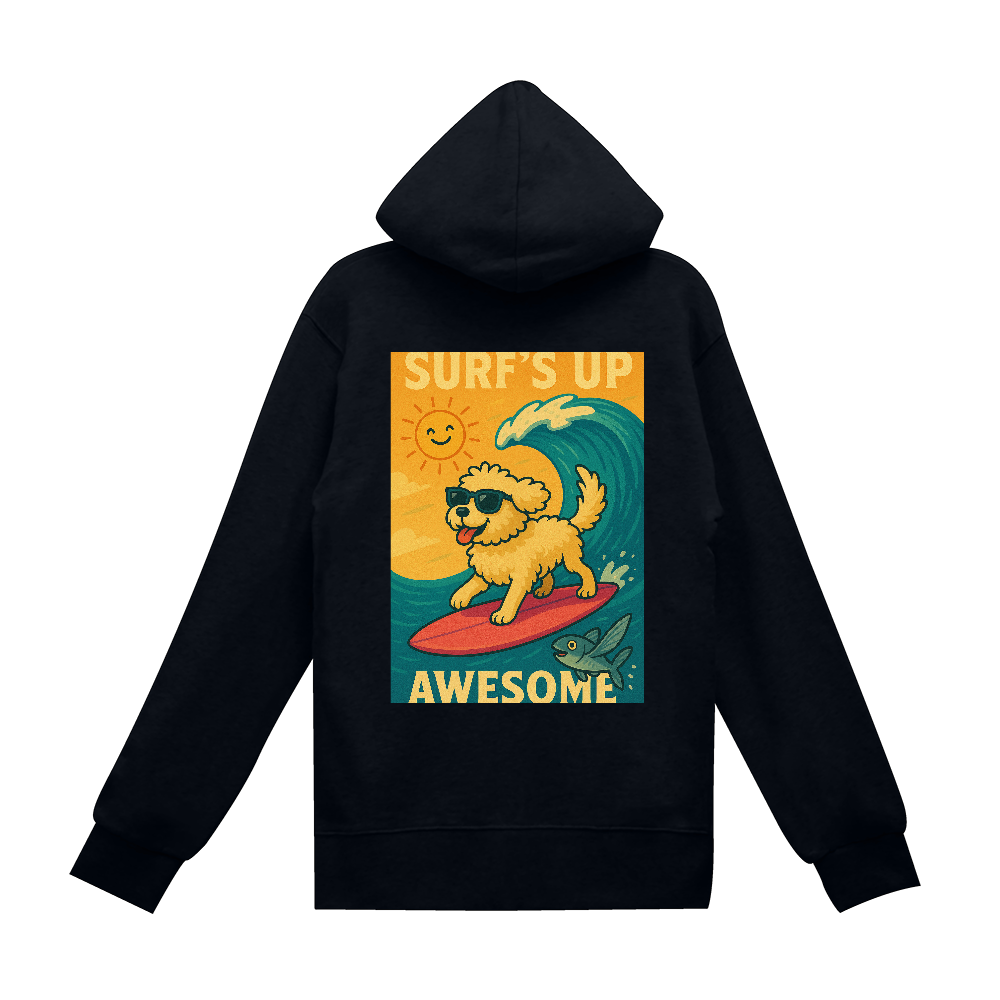 サングラスをかけたワンコがサーフボードで大波に挑む、遊び心たっぷりのデザインパーカー。