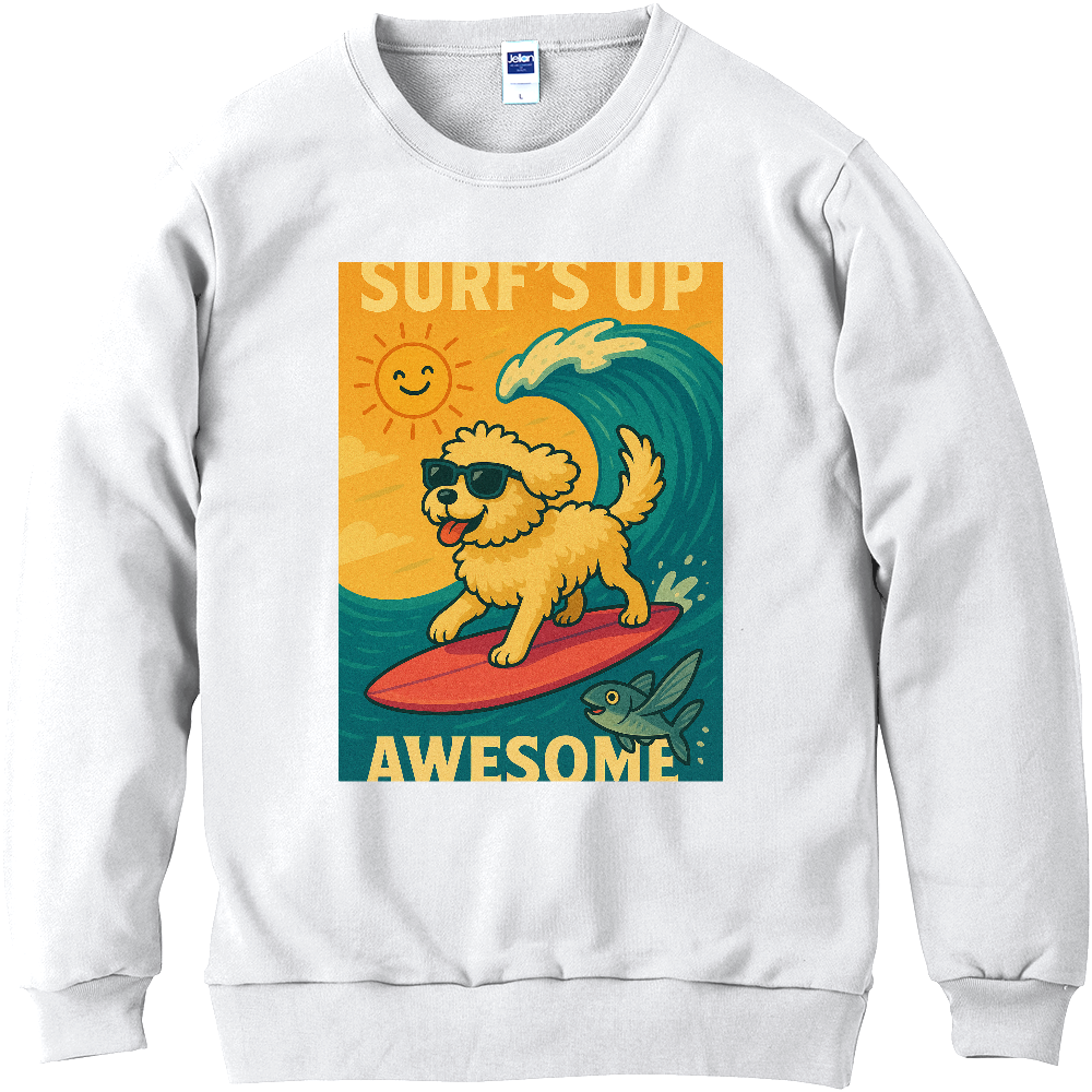 サングラスをかけたワンコがサーフボードで大波に挑む、遊び心たっぷりのデザインスウェット。
