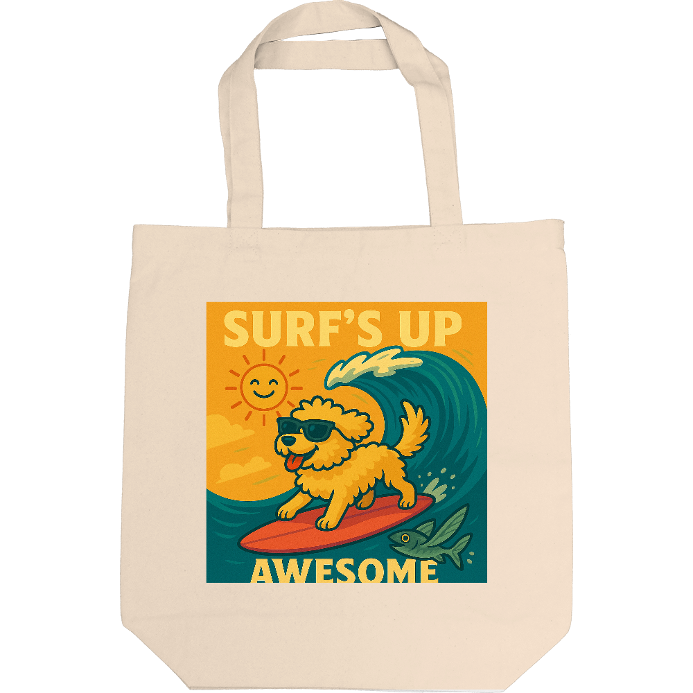 サングラスをかけたワンコがサーフボードで大波に挑む、遊び心たっぷりのデザイントート。