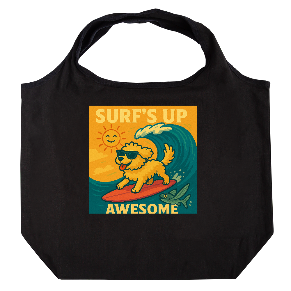 サングラスをかけたワンコがサーフボードで大波に挑む、遊び心たっぷりのデザインエコバッグ。
