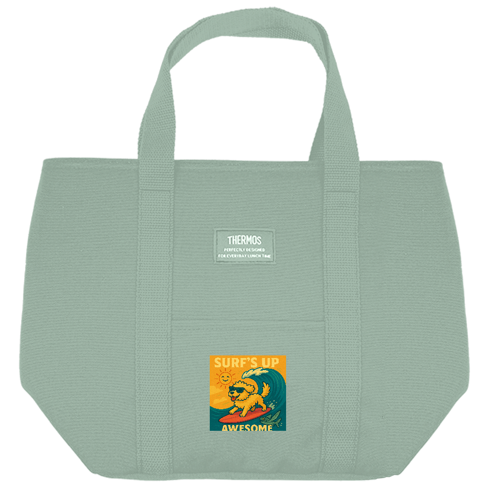 サングラスをかけたワンコがサーフボードで大波に挑む、遊び心たっぷりのデザインバッグ。