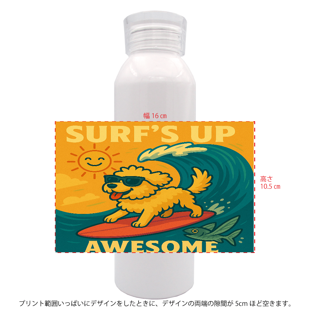 サングラスをかけたワンコがサーフボードで大波に挑む、遊び心たっぷりのデザインボトル。