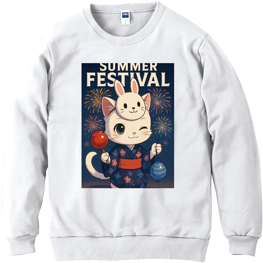 頭にはウサギのお面、手にはりんご飴と水風船を持ち、夏祭りの楽しさをそのまま閉じ込めました。