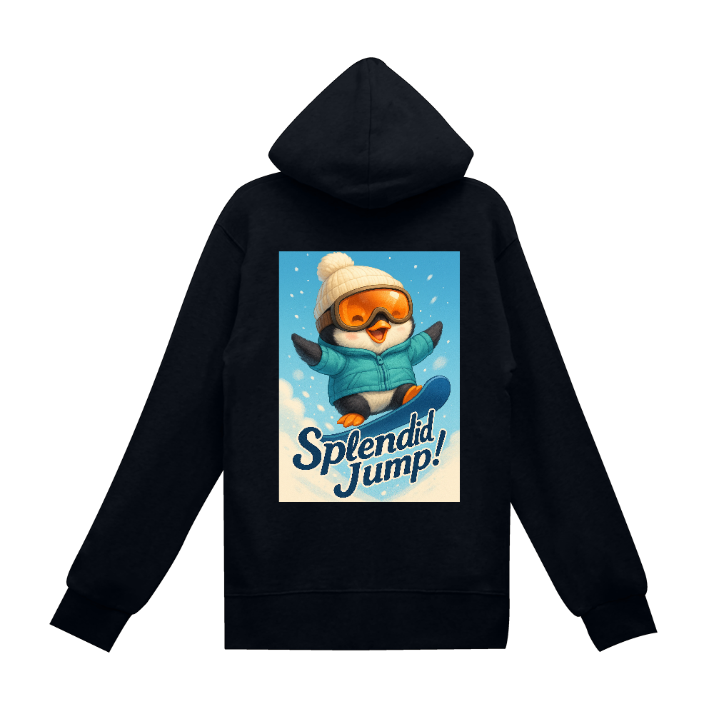 雪山を駆け抜ける元気いっぱいのペンギンが描かれた「Splendid Jump!」パーカー。