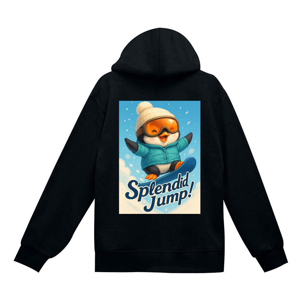 雪山を駆け抜ける元気いっぱいのペンギンが描かれた「Splendid Jump!」パーカー。