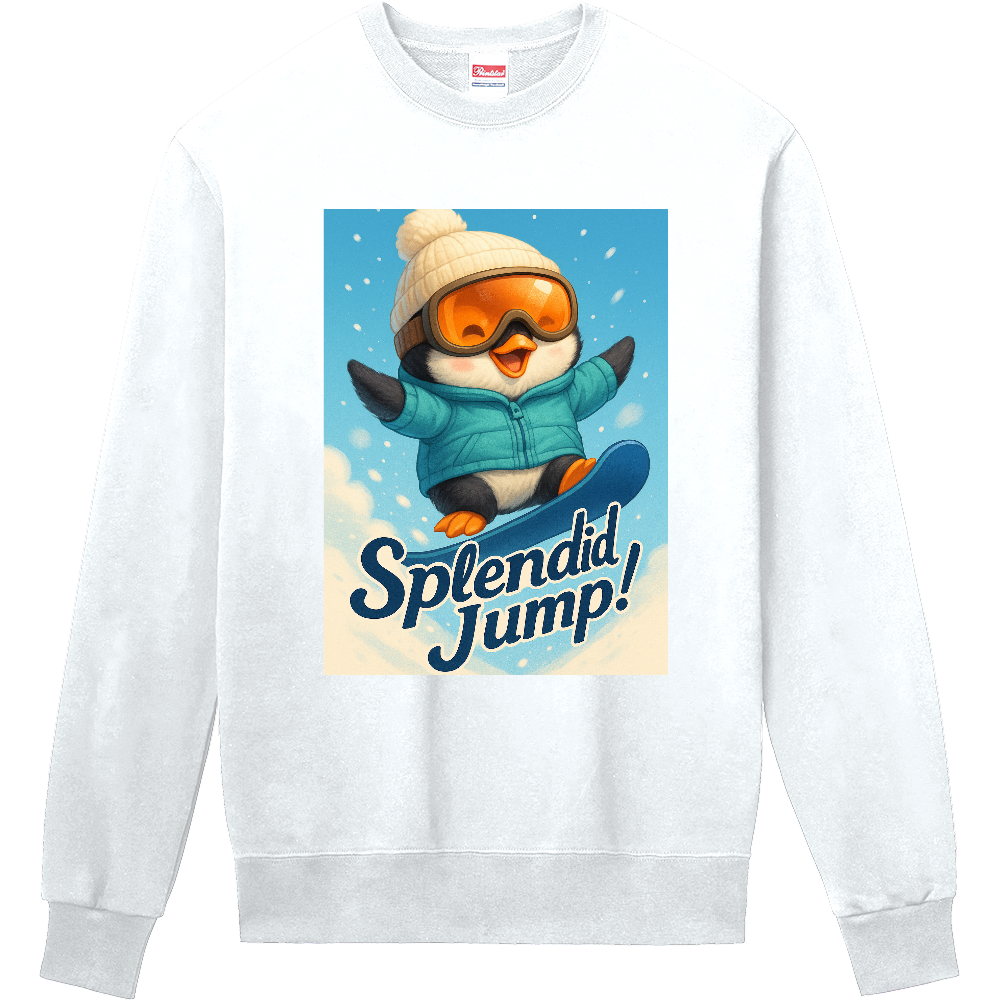 雪山を駆け抜ける元気いっぱいのペンギンが描かれた「Splendid Jump!」スウェット。