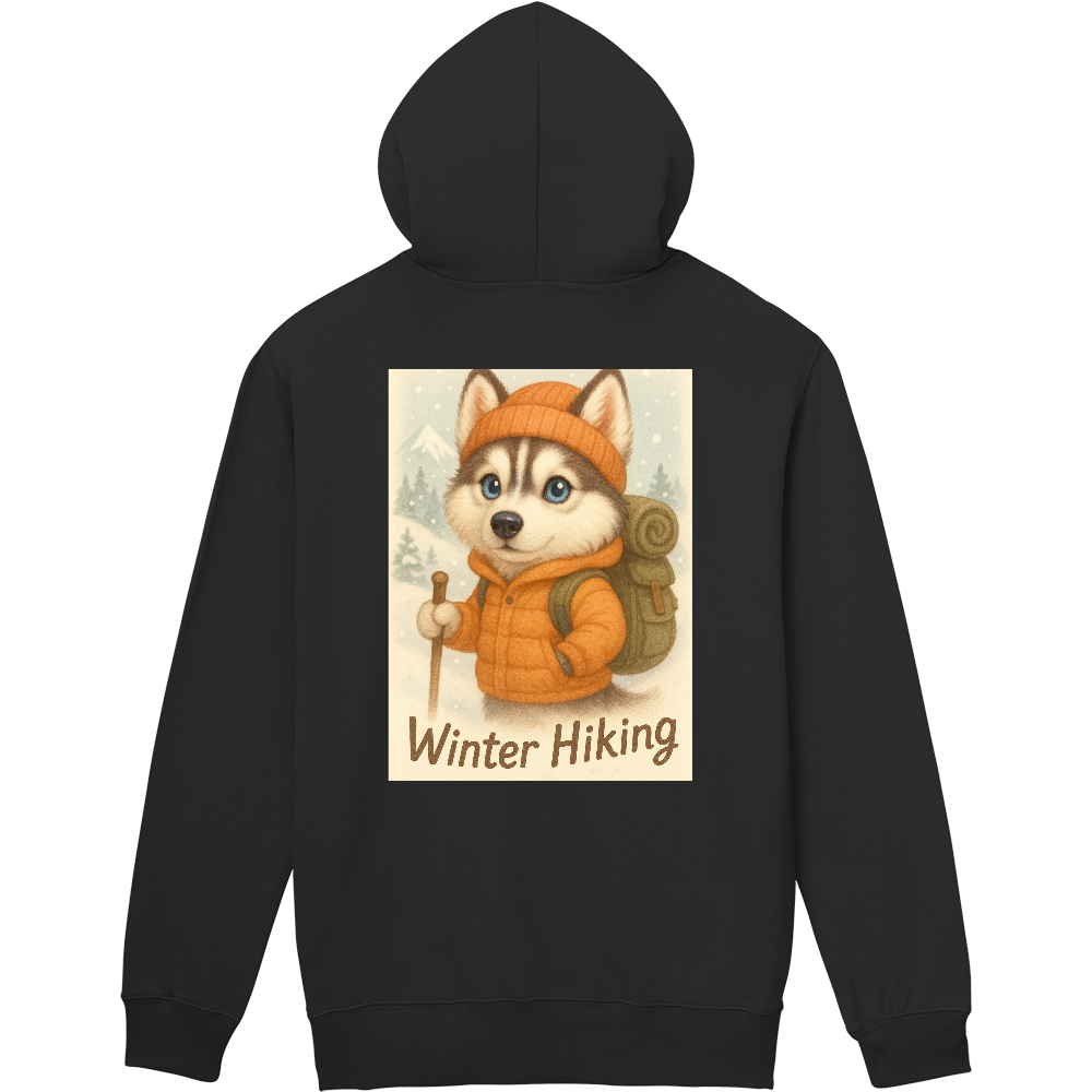 ふんわりとしたタッチで描かれた、可愛いハスキーが冬山を登る「ゆるふわ系」デザインパーカー。