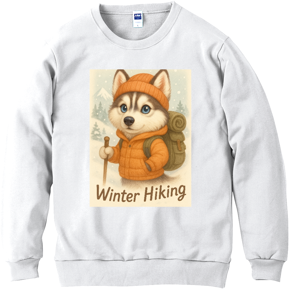 ふんわりとしたタッチで描かれた、可愛いハスキーが冬山を登る「ゆるふわ系」スウェット。