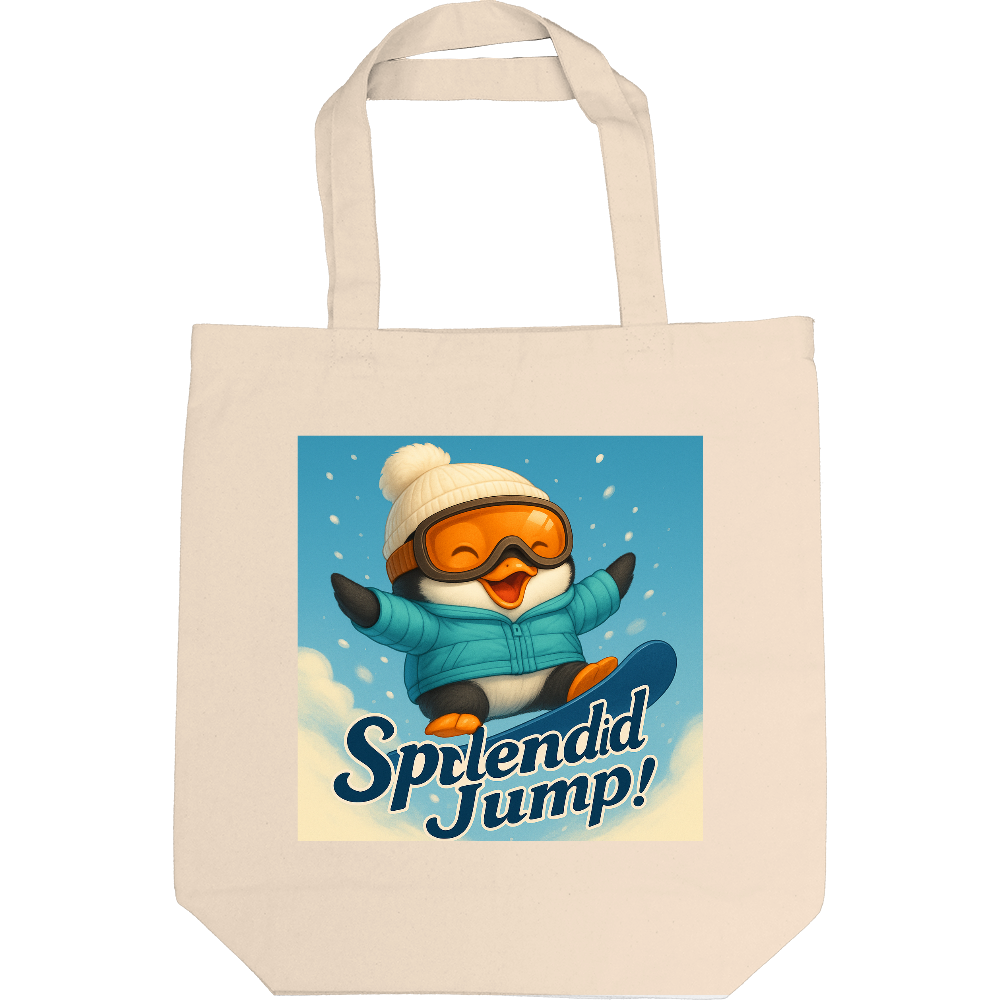 雪山を駆け抜ける元気いっぱいのペンギンが描かれた「Splendid Jump!」トート。