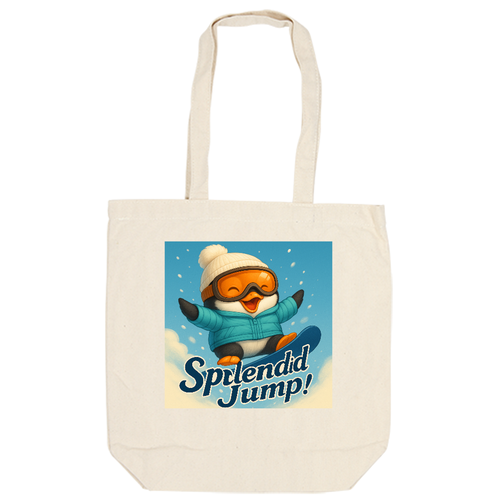 雪山を駆け抜ける元気いっぱいのペンギンが描かれた「Splendid Jump!」アイテム。