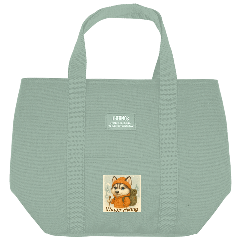 ふんわりとしたタッチで描かれた、可愛いハスキーが冬山を登る「ゆるふわ系」デザインバッグ。