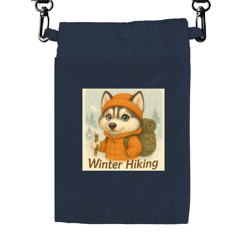 ふんわりとしたタッチで描かれた、可愛いハスキーが冬山を登る「ゆるふわ系」デザインバッグ。