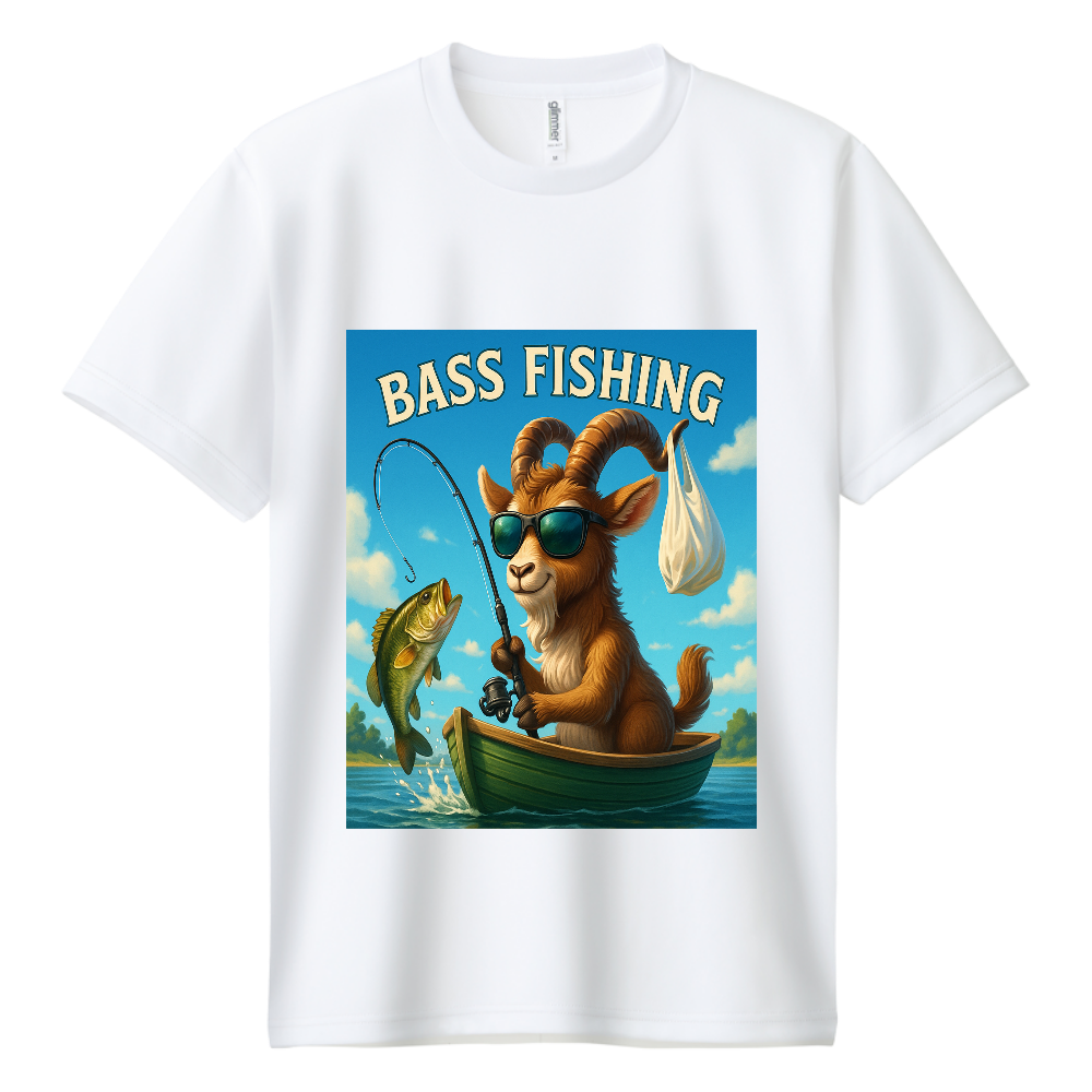 大きなサングラスをかけた山羊が、ブラックバス釣りを楽しむユニークなイラストをデザインしたTシャツです。 右のツノにはコンビニ袋をぶら下げ、湖上で余裕のフィッシングスタイルを披露。 遊び心とアウトドア感が融合した、他にはない個性的なデザイン。