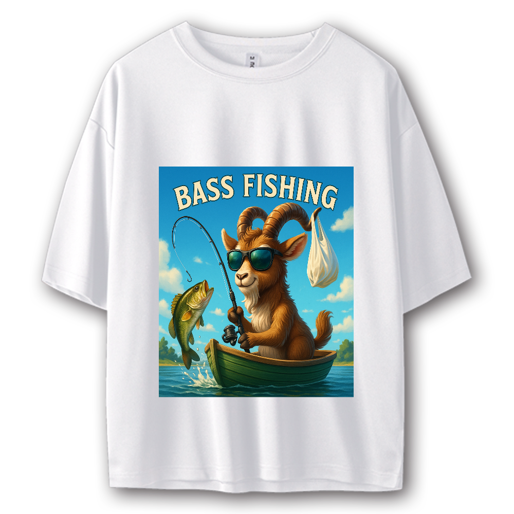 大きなサングラスをかけた山羊が、ブラックバス釣りを楽しむユニークなイラストをデザインしたTシャツです。 右のツノにはコンビニ袋をぶら下げ、湖上で余裕のフィッシングスタイルを披露。 遊び心とアウトドア感が融合した、他にはない個性的なデザイン。