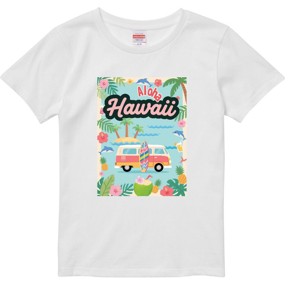 Tシャツ全体に広がるのは、ハワイの美しい風景と象徴的なモチーフが、ポップなタッチで描かれた心ときめくデザインで、中央には、どこか懐かしさを感じるフォルムのサーフバンが、カラフルなサーフボードを積んで佇んでいます。