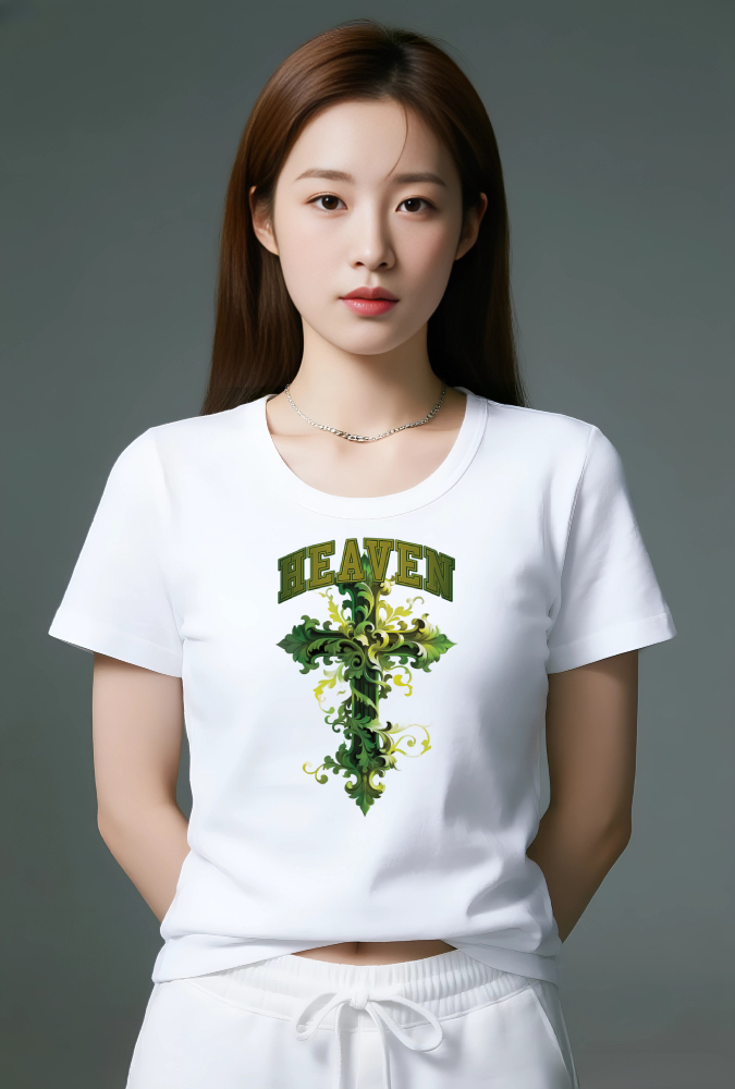 上部に大胆に配された「HEAVEN」の文字は、このクロスの荘厳さをさらに引き立て、天国への道しるべというメッセージを力強く示唆しています。信仰を大切にする方だけでなく、自然やスピリチュアルなアートを好む方にも響く、ユニークなデザインです。