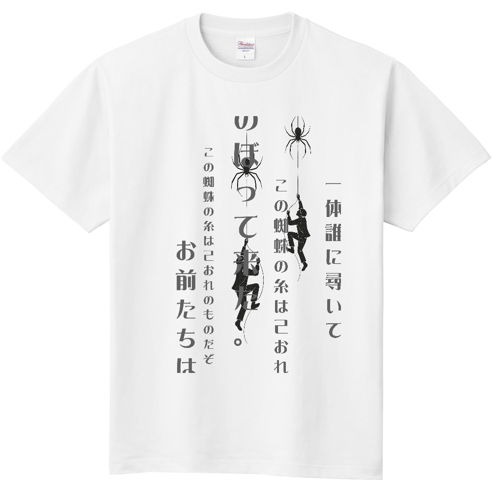 登場人物を群像で描き、そこに名台詞の一節を重ねることで、物語の「運命の瞬間」をTシャツ上に凝縮しました。