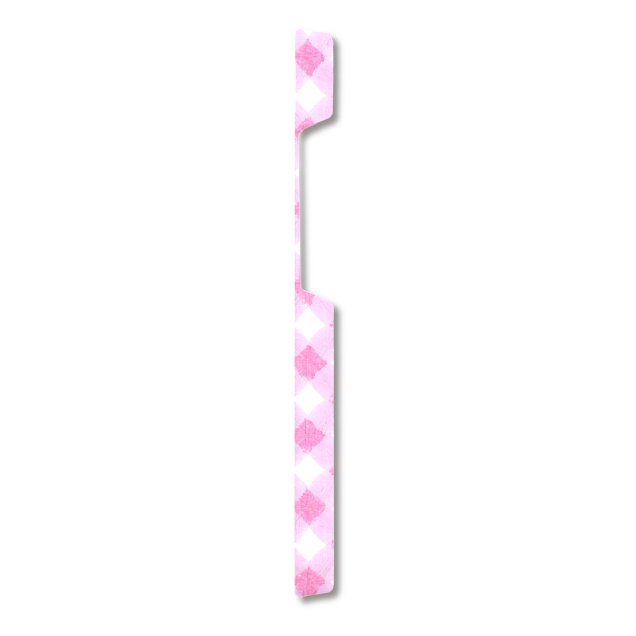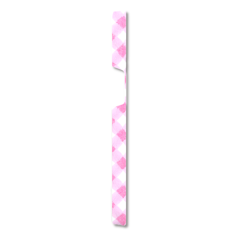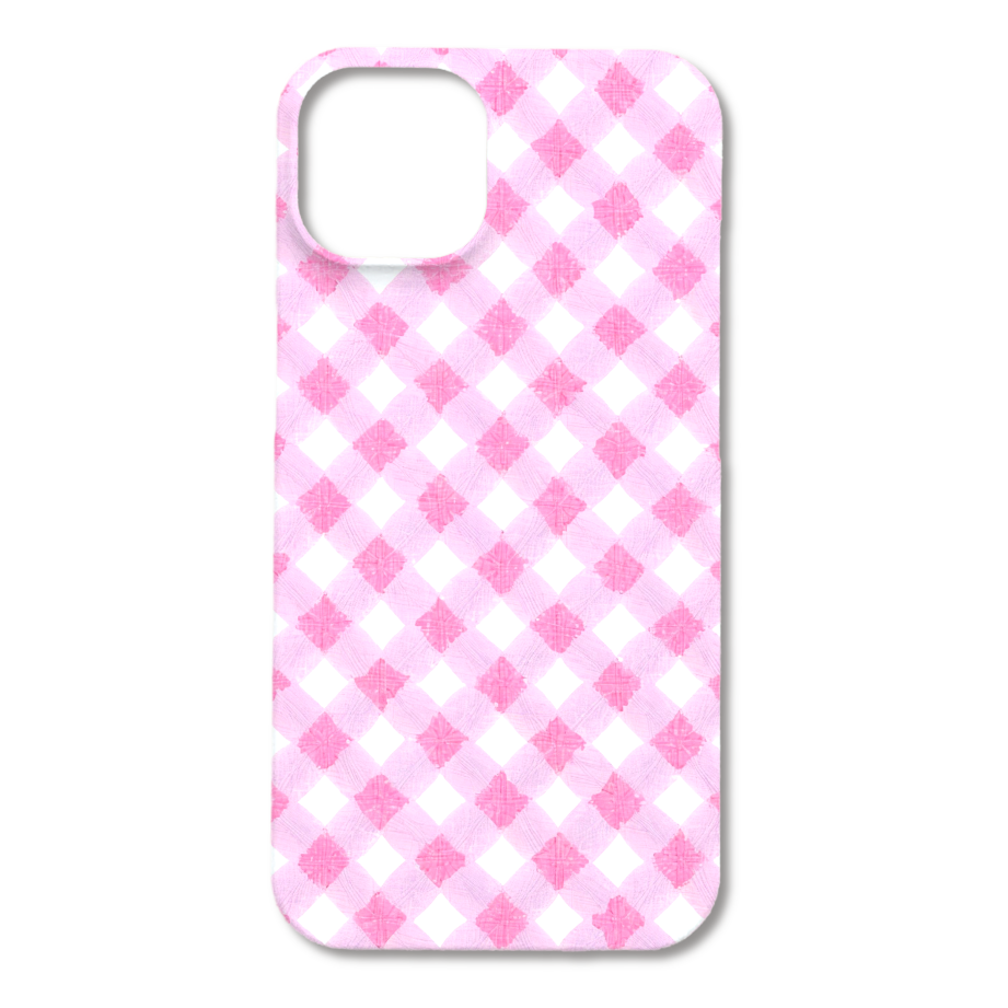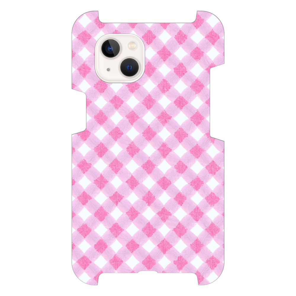 このスマートフォンケースは、かわいらしいピンクのギンガムチェック柄が特徴的な、キュートでガーリーなデザインです。まるで布のような柔らかなテクスチャが表現されており、暖かみのある優しい印象を与えます。濃淡の異なるピンクが重なり合うことで、奥行きのあるふんわりとした雰囲気が生まれています。