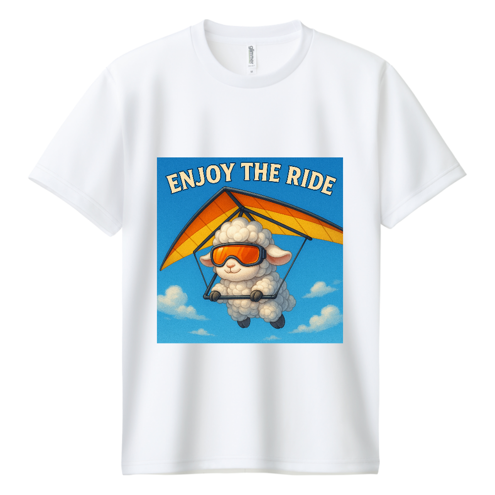 ふわふわの羊がオレンジのゴーグルをかけて、青空の下をハンググライダーで駆け抜けるポップでユニークなデザイン。
