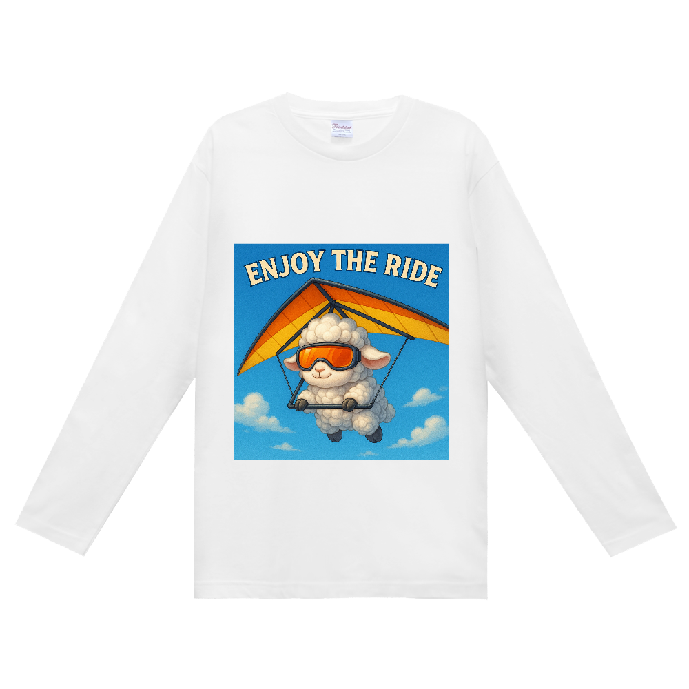 ふわふわの羊がオレンジのゴーグルをかけて、青空の下をハンググライダーで駆け抜けるポップでユニークなデザイン。