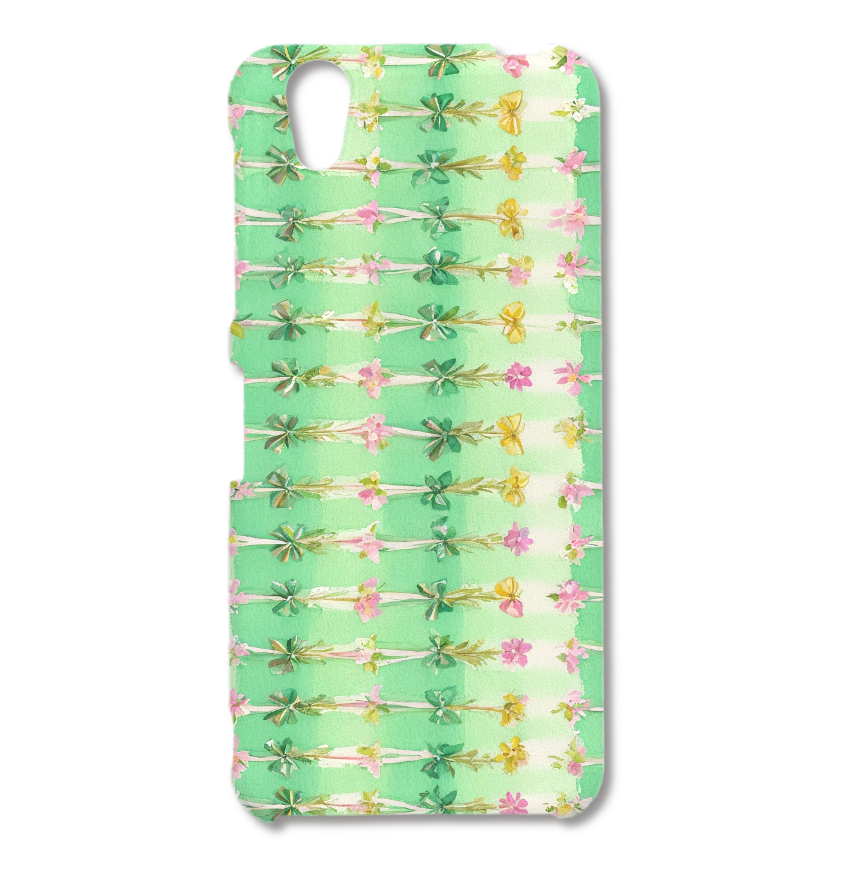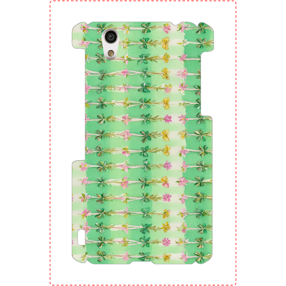 柔らかな水彩タッチで描かれた、フェミニンでエレガントなデザインのスマホケースです。ピンクや黄色の可愛らしい小花と、繊細なリボンがストライプ状に配置されています。グリーン系の背景が爽やかで、どんなファッションにも合わせやすいデザインです。