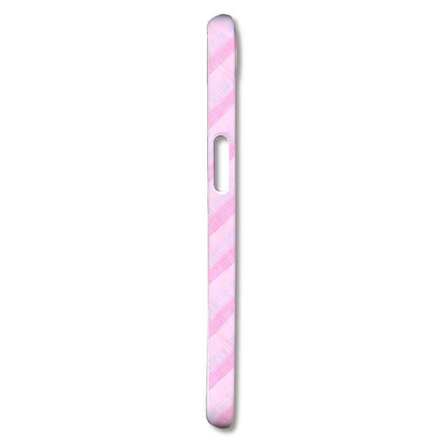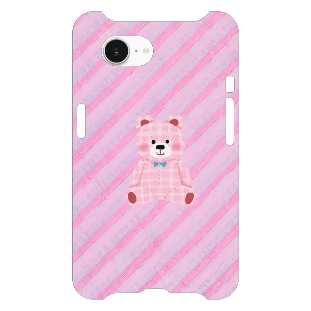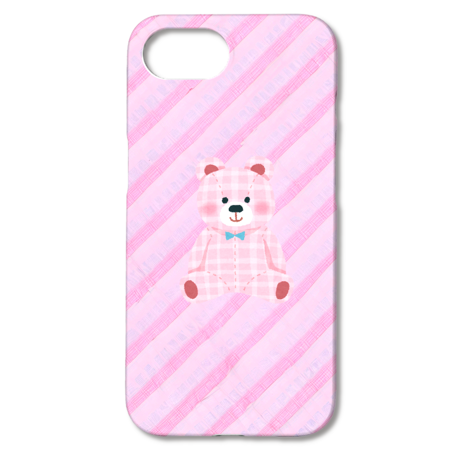 柔らかなトーンのピンクを基調とした、斜めストライプ柄のスマホケースに、ピンクのギンガムチェック柄が可愛らしいくまさんを配置しました。落ち着いた色合いのストライプと、その間に織り込まれたような繊細な模様が、シンプルながらも上品でフェミニンな雰囲気を演出します。手描き風のテクスチャと愛らしいくまさんの組み合わせが、スマホを持つたびに心を癒してくれます。