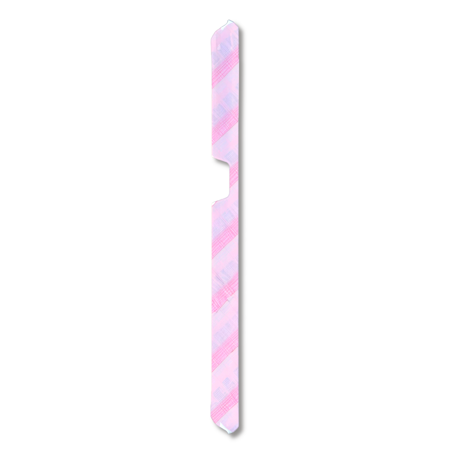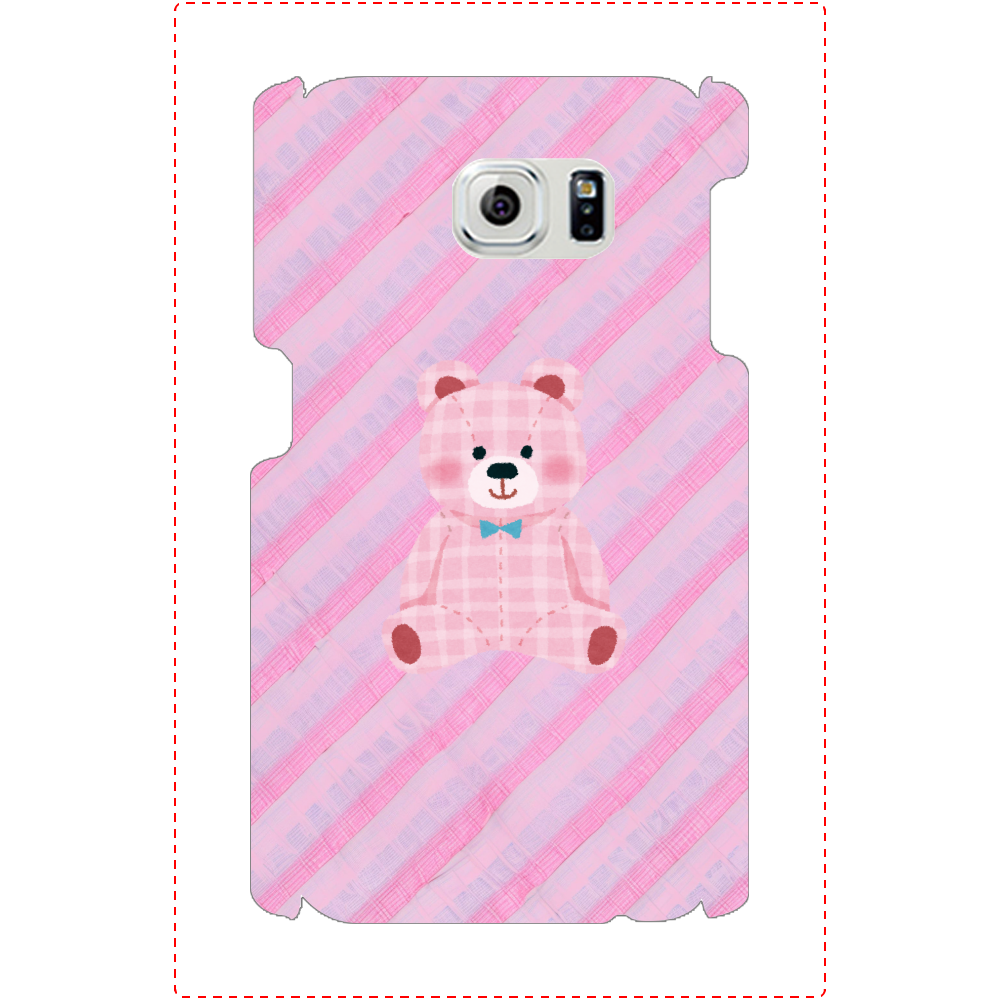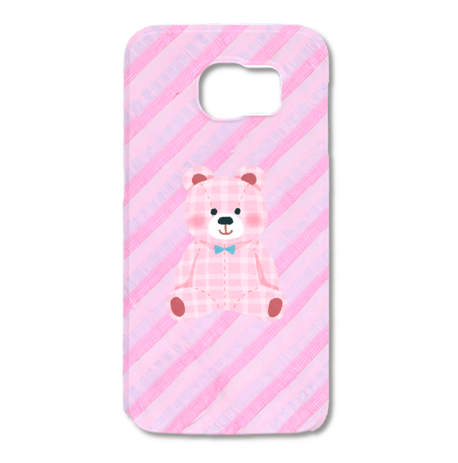 柔らかなトーンのピンクを基調とした、斜めストライプ柄のスマホケースに、ピンクのギンガムチェック柄が可愛らしいくまさんを配置しました。落ち着いた色合いのストライプと、その間に織り込まれたような繊細な模様が、シンプルながらも上品でフェミニンな雰囲気を演出します。手描き風のテクスチャと愛らしいくまさんの組み合わせが、スマホを持つたびに心を癒してくれます。