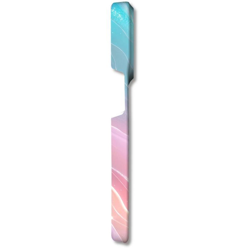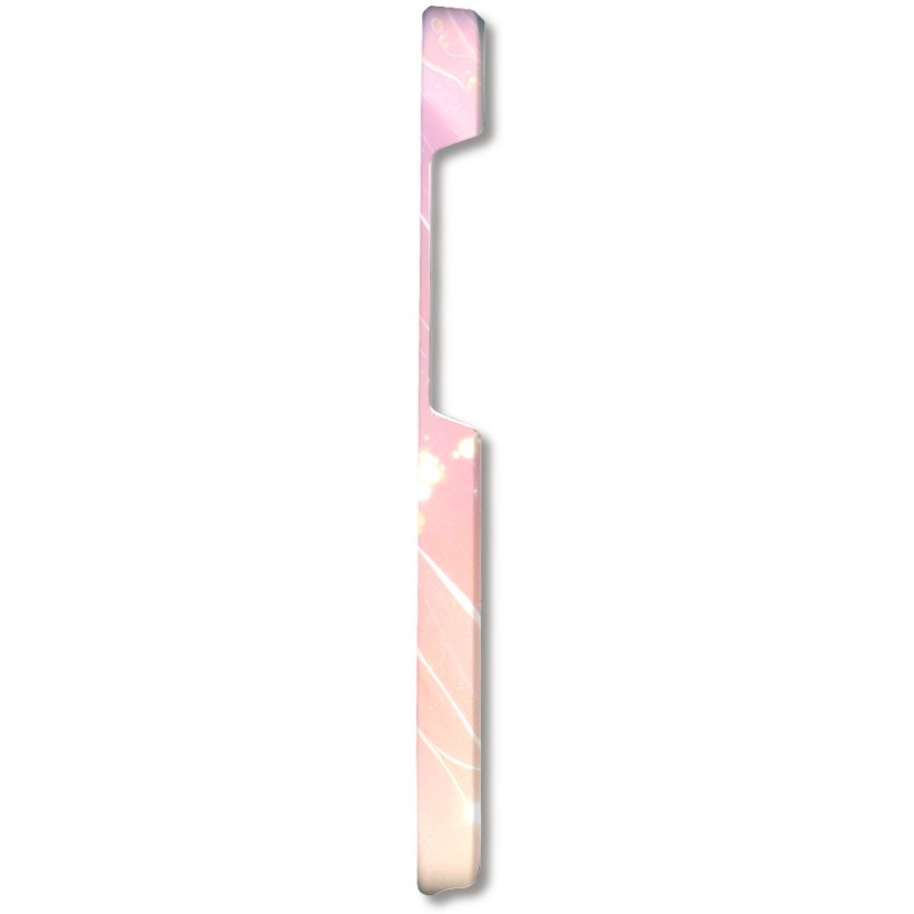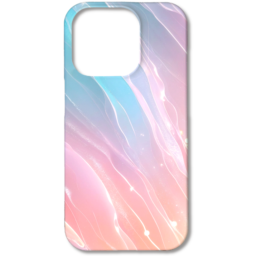 まるで夜空にきらめくオーロラのような、幻想的なグラデーションデザインのスマホケースです。パステルブルー、ピンク、オレンジがなめらかに溶け合い、きらきらと輝く光の粒や流れるようなラインが、魔法のような雰囲気を演出します。見る角度によって表情を変える、まるで生きているかのようなデザインが特徴です。
