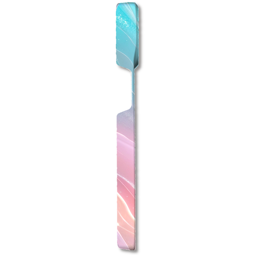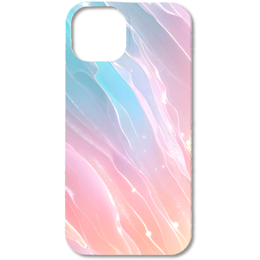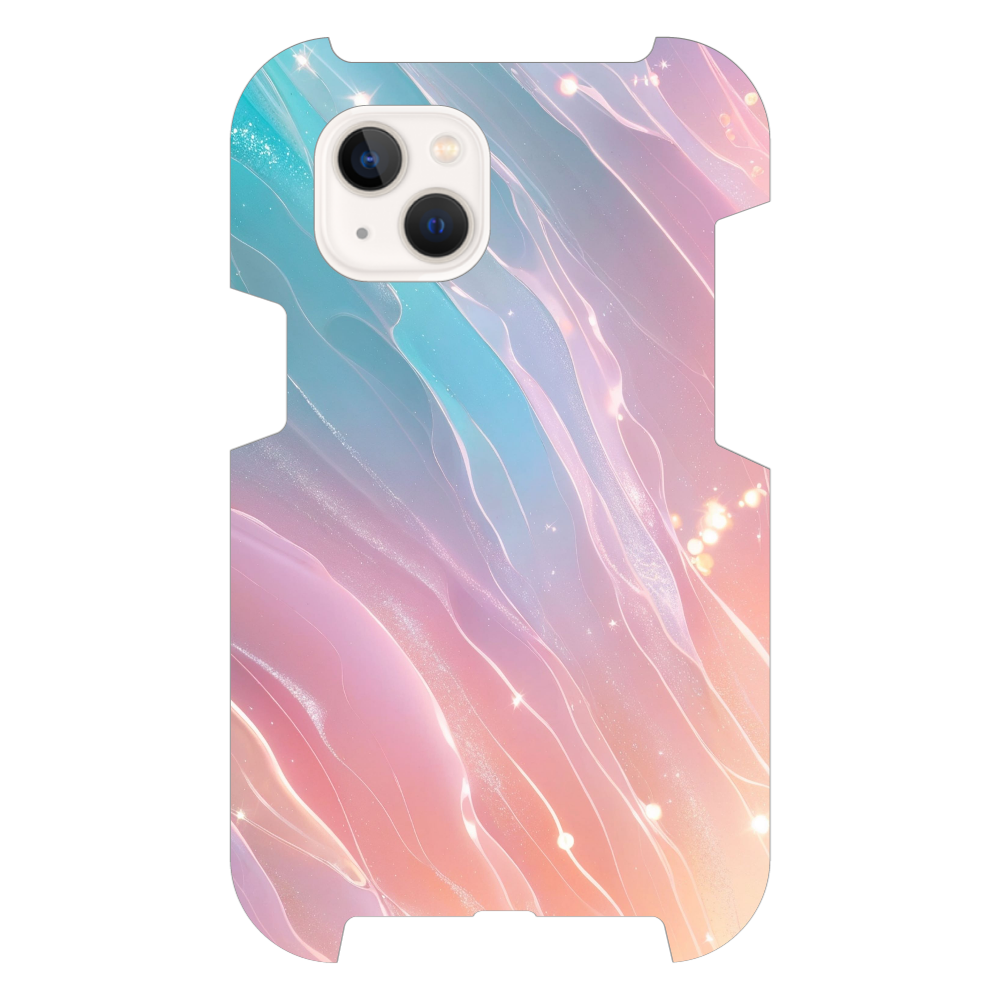 まるで夜空にきらめくオーロラのような、幻想的なグラデーションデザインのスマホケースです。パステルブルー、ピンク、オレンジがなめらかに溶け合い、きらきらと輝く光の粒や流れるようなラインが、魔法のような雰囲気を演出します。見る角度によって表情を変える、まるで生きているかのようなデザインが特徴です。
