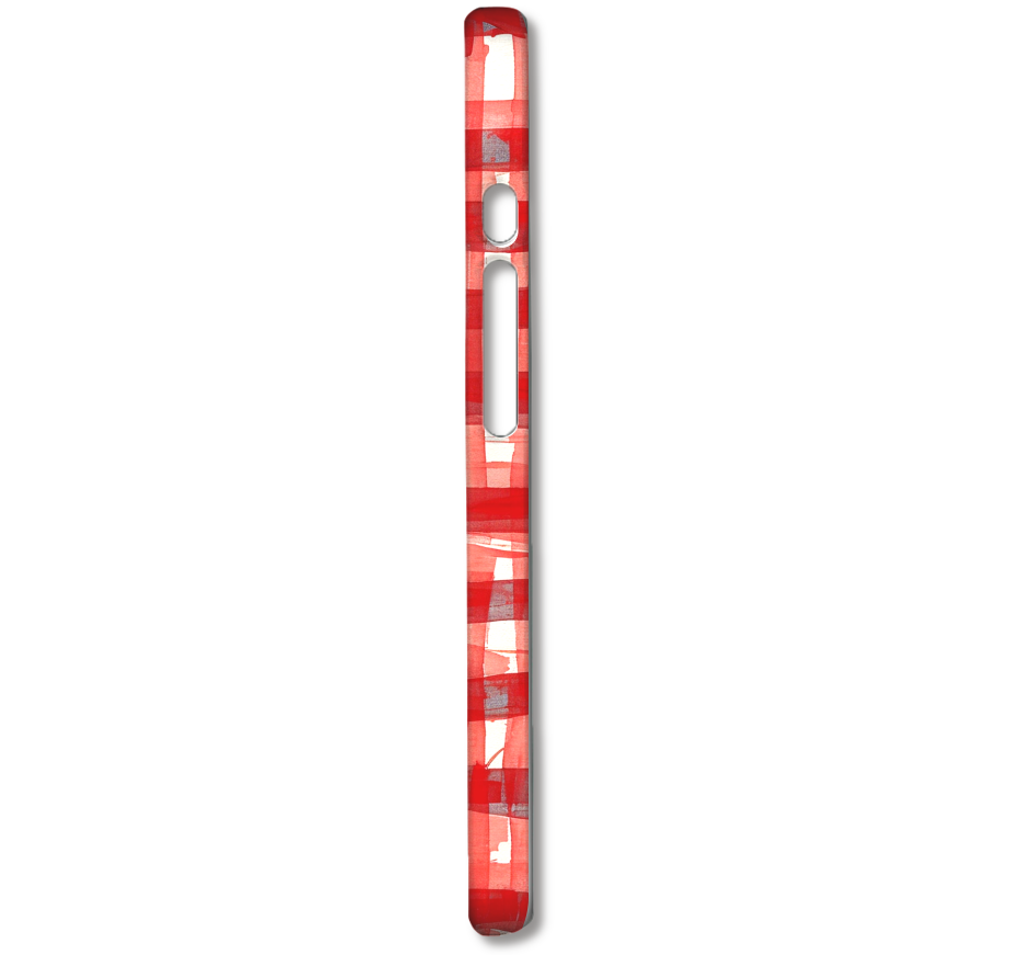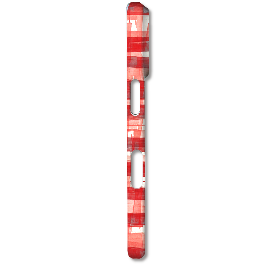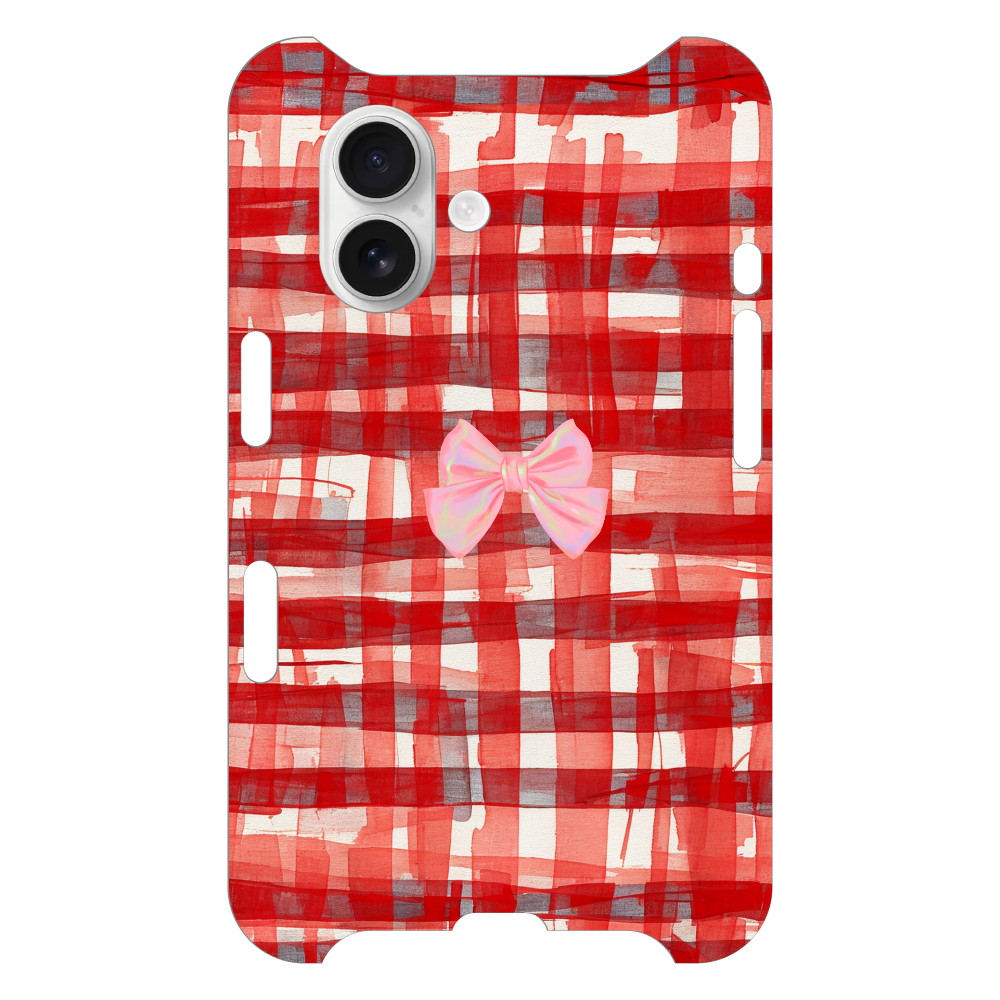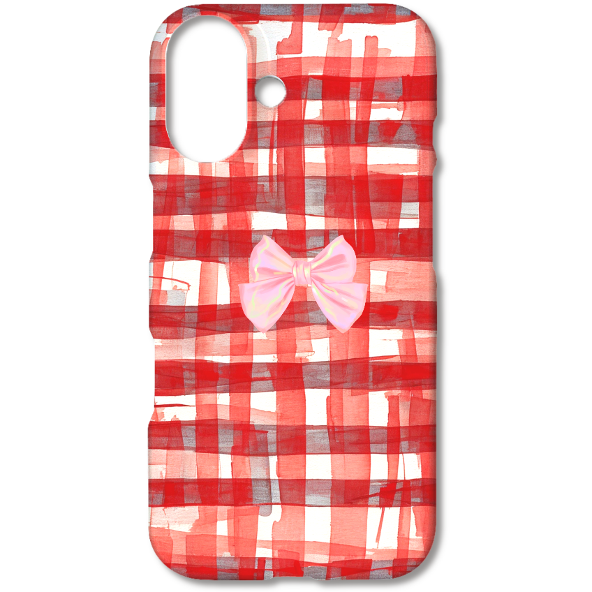 大胆な筆使いで描かれた、赤いチェック柄が目を引くデザインのスマホケースです。一般的なチェック柄とは一味違う、手描きならではの温かみと力強さが特徴です。中央に配置された立体的なピンクのリボンが、デザイン全体に可愛らしさと上品なアクセントを加えています。不揃いな線と滑らかなリボンのコントラストが、ユニークでアートのような雰囲気を醸し出しています。