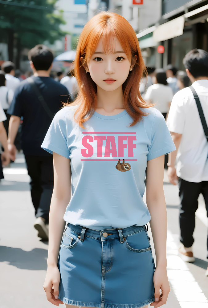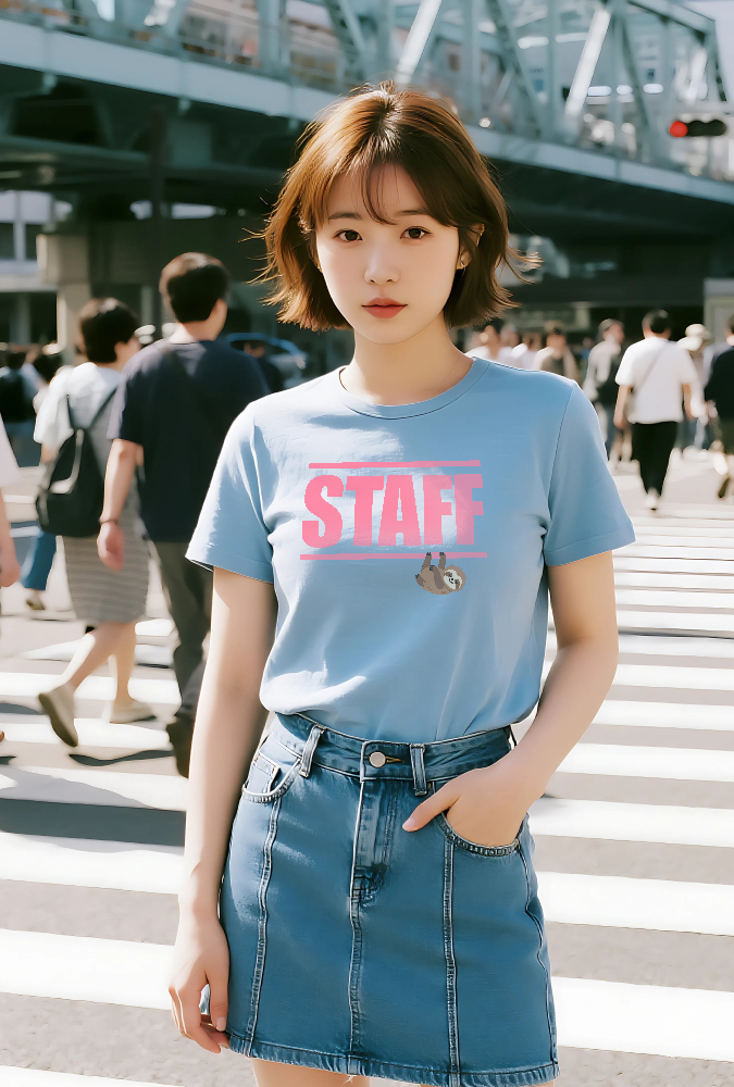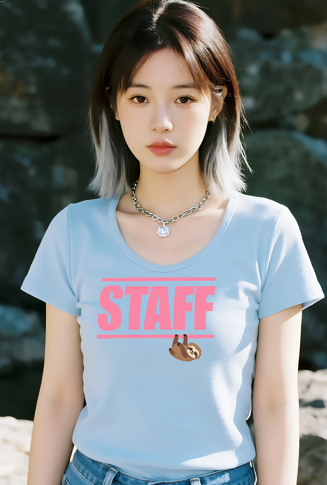 ユニークで目を引く「STAFF」Tシャツが登場!忙しい毎日にちょっとした癒しを届ける、キュートなナマケモノのイラストが特徴です。